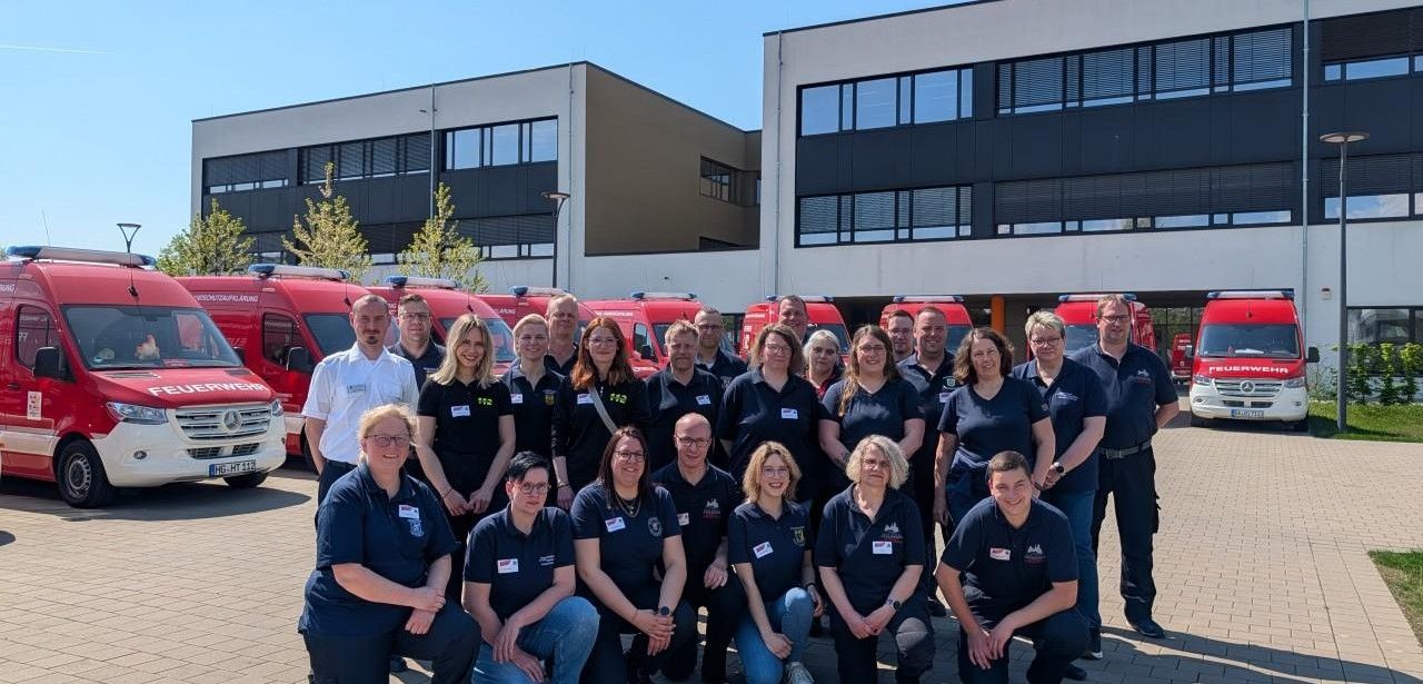 Landrat Engelhardt, Bürgermeisterin Klein und Feuerwehrführung begrüßen heute Teilnehmer