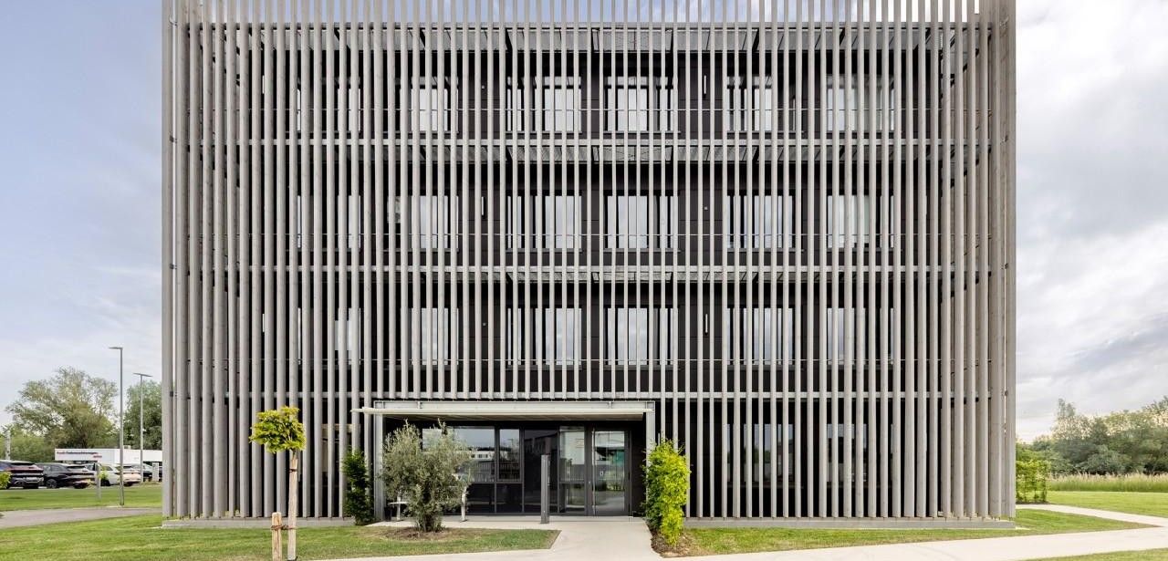Hinter einer filigranen Fichtenholzlamellenstruktur von vierzehn Metern Länge und achtzig Millimetern Breite verbirgt sich die Fassade des viergeschossigen Baus. Die Lamellen filtern direktes Sonnenlicht, verringern sommerliche Überhitzung und sorgen gleichzeitig für blendfreies Tageslicht. Zugleich übernehmen sie die tragende Funktion für umlaufende Balkone aus Stahl und fungieren als alternativer Rettungsweg. In Verbindung mit massiven Stahlbetonaußenwänden und Decken wird nachts überschüssige Wärme abgeführt, um tagsüber ein behagliches Raumklima aufrechtzuerhalten ganzjährig energieoptimiert nachhaltig.