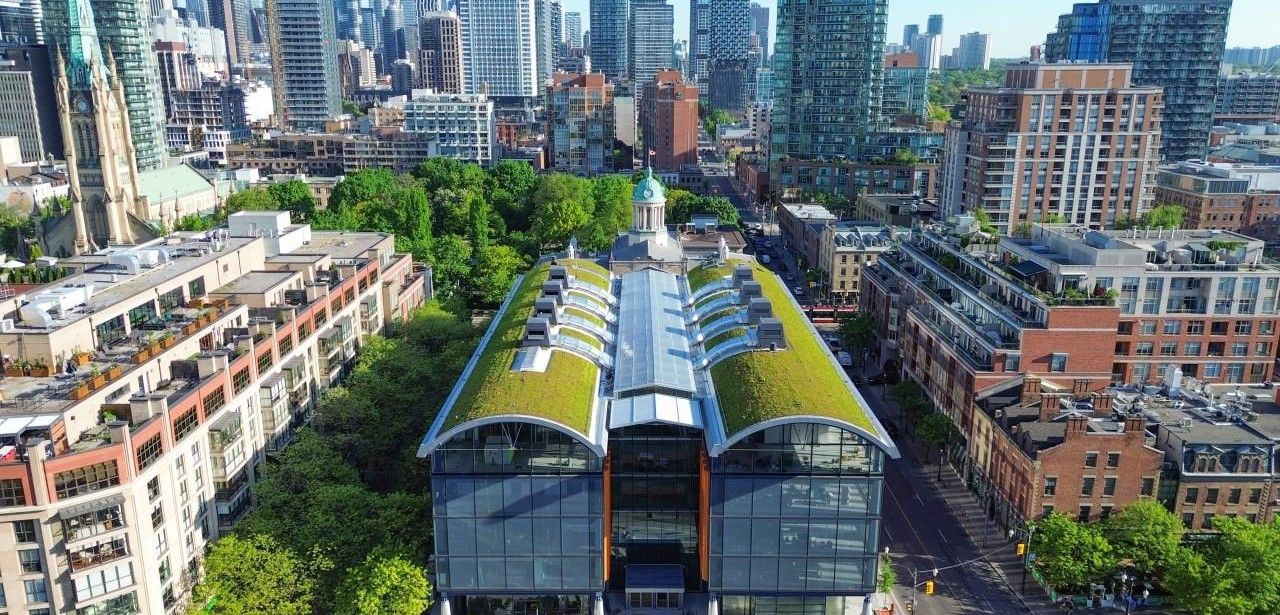 Mit dem neuen St. Lawrence Market North in Toronto erweitern RSHP und Adamson Associates das historische Marktareal um eine fünfstöckige Konstruktion. Ein zentrales Glasfoyer versorgt sämtliche Ebenen mit Tageslicht und unterstützt natürliche Belüftung. Zinco begrünte 1.500 Quadratmeter Tonnendach mit Floraset FS 75 sowie Georaster-Systemen. Die Pflanzenmatten wirken als natürliche Dämmung, liefern Verdunstungskälte, binden Regenwasser und verbessern das Mikroklima, womit ein naturnaher, urbaner Lebensraum entsteht und reduzieren langfristig den Energieaufwand nachhaltig.